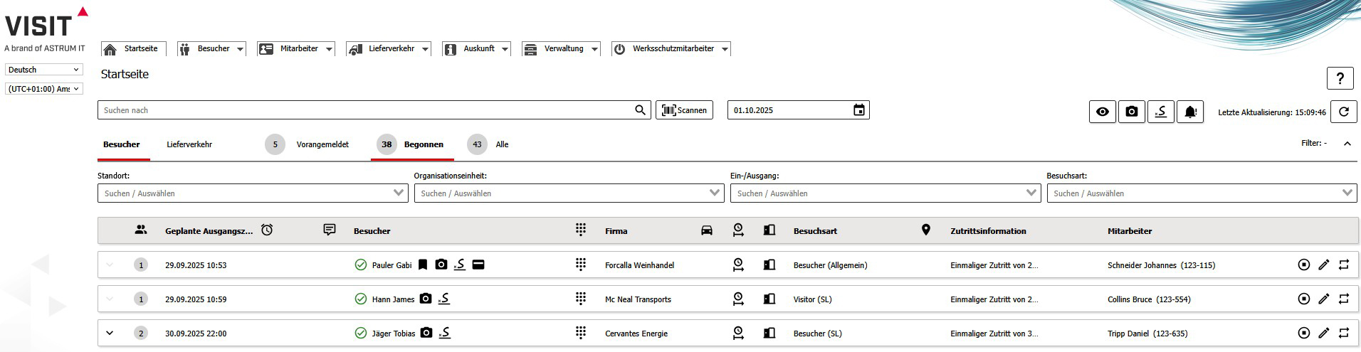 Nach intensiver Arbeit möchten wir Ihnen nun unser neues Cockpit vorstellen. Die zentrale Übersicht für jeden Werkschützer über alle Besuche, die vorangemeldet, angekommen oder begonnen sind. Von hier aus ist es möglich die einzelnen Besuche zu öffnen, zu bearbeiten, vorangemeldete und angekommene Besuche zu beginnen oder bereits begonnene Besuche zu beenden.